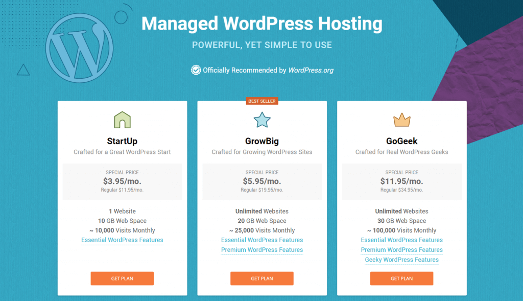 • StartUp: supports 1 website with 10 GB of storage and allows up to 10,000 monthly visits
